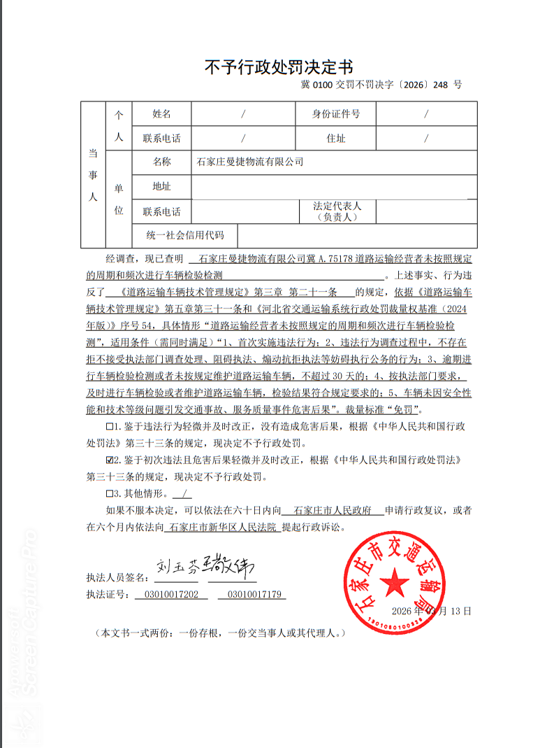 石家庄曼捷物流有限公司冀A.75178道路运输经营者未按照规定的周期和频次进行车辆检验检测冀0100交罚不罚决字〔2026〕248 号