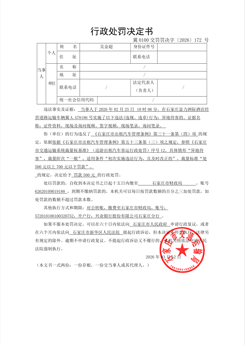 吴金超驾驶冀A.A78186号出租汽车异地待客的( 冀0100交罚罚决字〔2026〕172 号)