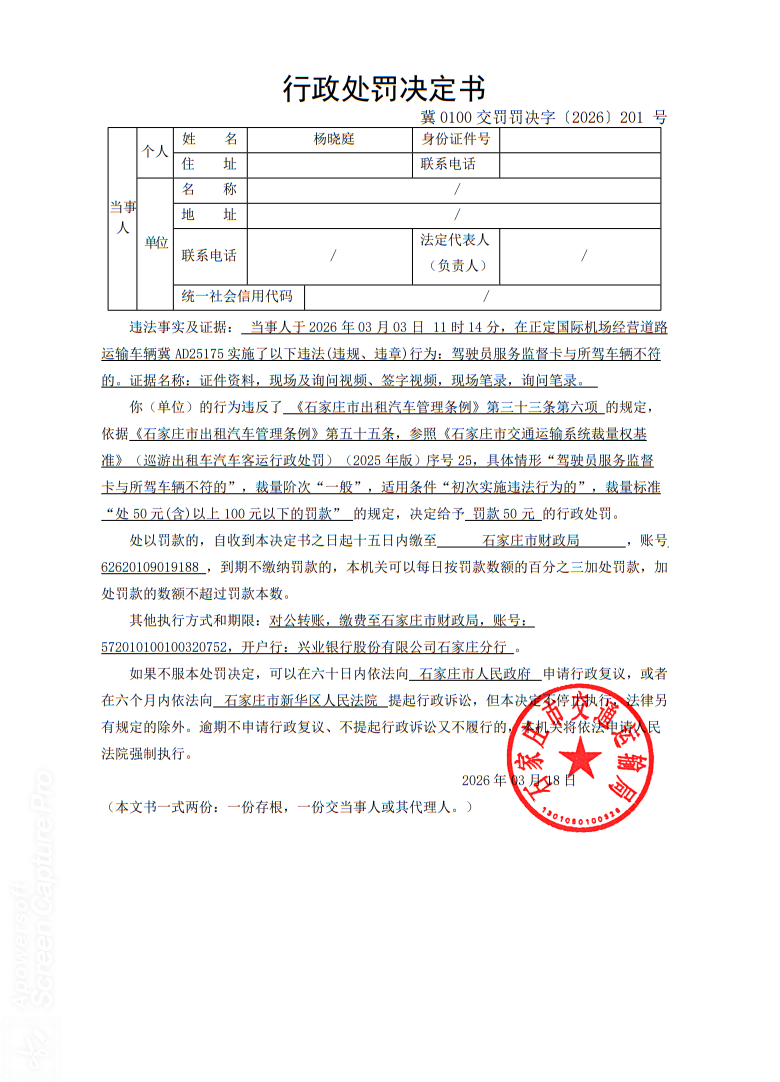 杨晓庭冀AD25175驾驶员服务监督卡与所驾车辆不符的冀0100交罚罚决字〔2026〕201 号