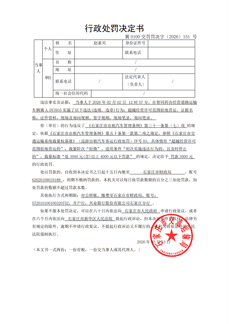 赵素兴驾驶冀A.DY3935超越经营许可范围驻地营运(冀0100交罚罚决字〔2026〕151 号)